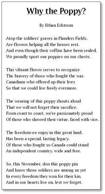 Mr. Ethan Harry Edstrom is from Edmonton, AB, and his poem was submitted through Strathcona Legion Branch #150 in Edmonton, AB. He is currently attending Tempo School in Edmonton, AB. In 2014 he launched his own charity called: “Saves for Socks” which aims to collect socks for the homeless. In 2015 he was awarded the Wayne Gretzky Award. His hobbies include participating in Model United Nations for High School students.